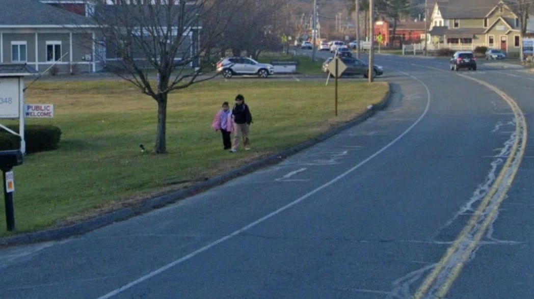 Residents I spoke to at the time described speeding traffic, near-misses, and the daily calculation required to cross Route 7 safely. I also found Google Street View images that showed two backpack-laden children walking along the grass where a sidewalk should be.