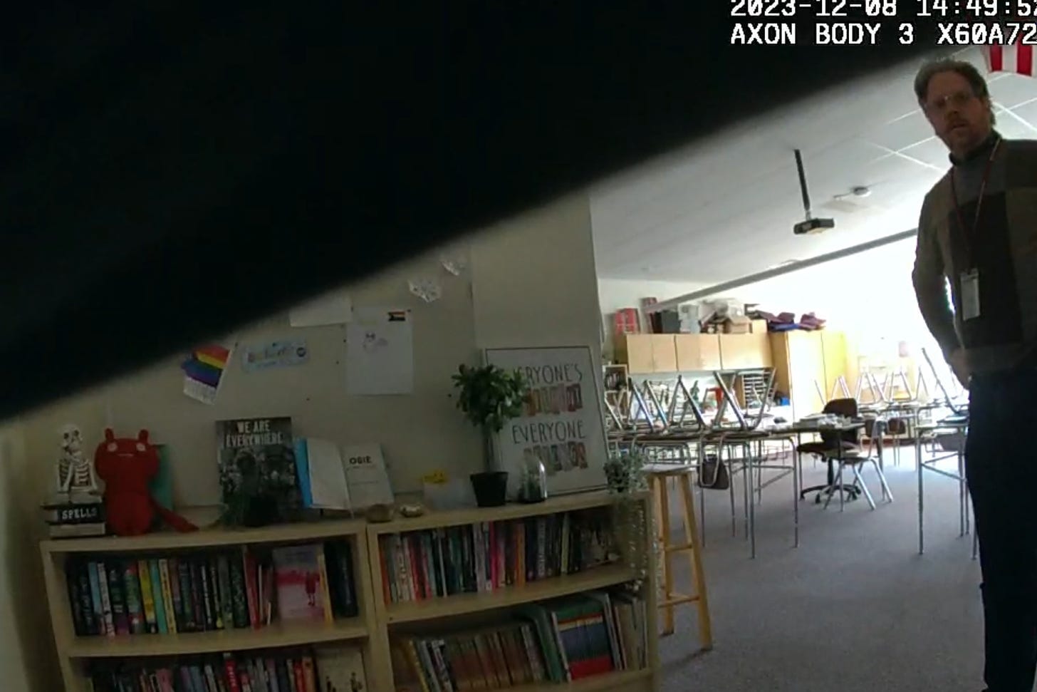 He spent several minutes walking me through the bodycam footage recorded as O’Brien moved around the classroom and questioned the teacher and principal. (During the eight-minute recording, the video was mostly obscured by a shirt pocket, but most of the audio can be heard clearly.) He ticked off a list of what he said were problematic actions and statements by O’Brien, including the officer’s assumption that he had “unfettered access to materials in the room.” That included student papers that Cooper said were private.
