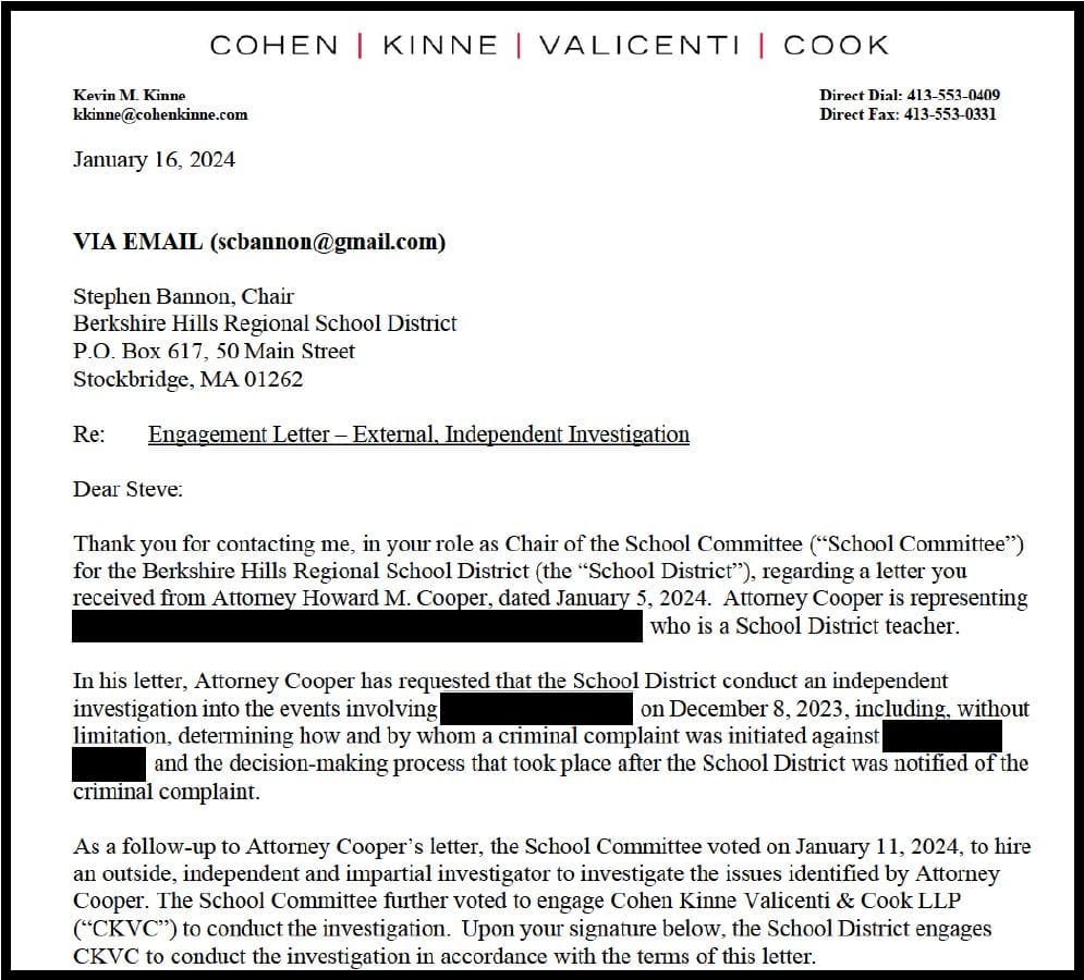 Under a cloud of “threatened litigation”—the phrase used to describe a School Committee executive session last month—both the school district and town of Great Barrington have since initiated those investigations. Neither body has publicly shared specifics about the scope of their investigations. But according to an engagement letter between the school district and law firm Cohen, Kinne, Valicenti and Cook, acquired by The Argus in a public-records request, it will focus specifically on “investigat[ing] the issues identified by Attorney Cooper,” which includes determining the identity of the complainant and detailing the decisions made after Storti called Dillon.