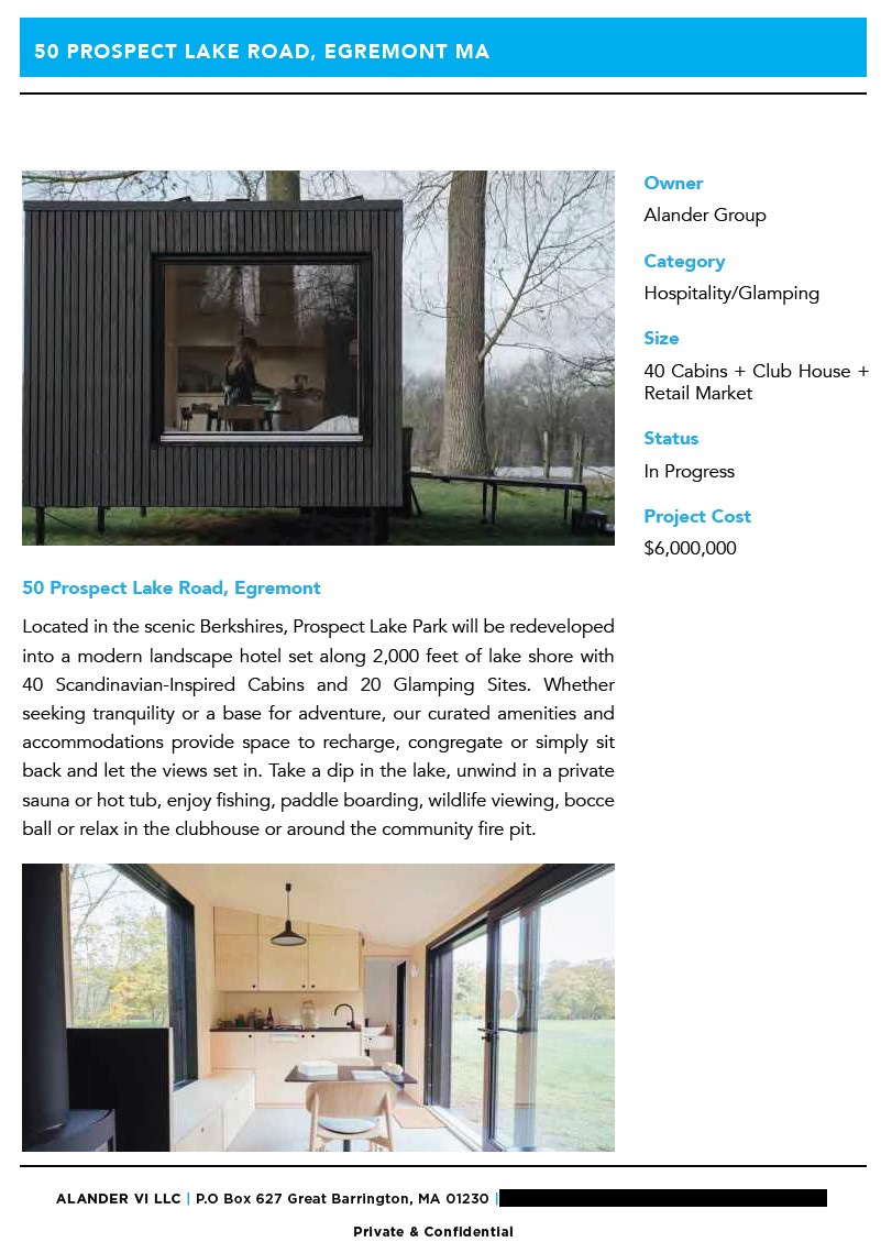 And while he still refers to the property as a “camp” or “campground”—cognizant, no doubt, of its preexisting nonconforming zoning status, with limits that bubbled up to the town’s Zoning Board of Appeals (ZBA) in May and with new intensity again this week—what he’s spending handsomely to create is called a “landscape hotel.” That’s according to information posted online [PDF] by multiple architects and consultants working on the project, documents and information conveyed by Alander Group to town boards in both Egremont and Great Barrington, and the limited details Rasch has shared since the purchase.
