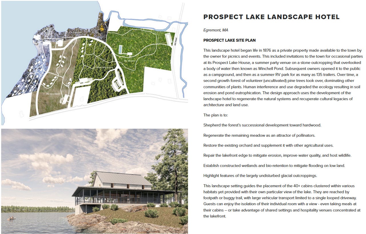 The “design approach uses the development of the landscape hotel to regenerate the natural systems and recuperate cultural legacies of architecture and land use,” according to the narrative. That’s led to substantial ecological-restoration work on the property that has, so far, included removal of more than 200 trees—at least some already dead or dying—and plans to replace the campground’s beach areas with “restored wetlands.” That means, as Rasch told me last year, access to the water for swimming will be via existing piers; there will be “no direct swimming areas,” as he told the Egremont Conservation Commission in July, 2022.