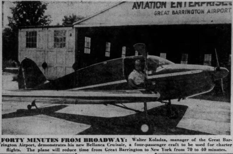 In those days, the airport on Egremont Plain Road—owned by Koladza from 1945 until his death in 2004—was sometimes used for medical emergencies. In 1949, a recently retired Alcoa executive named George J. Stanley was visiting from Pittsburgh and staying at downtown Great Barrington’s popular Berkshire Inn. But then he “took ill,” according to a Berkshire Eagle story. An ambulance rushed him from Fairview Hospital to the airport to meet a waiting National Guard C-47—a twin-engine military transport based on the civilian Douglas DC-3—that then flew him to Boston for treatment.