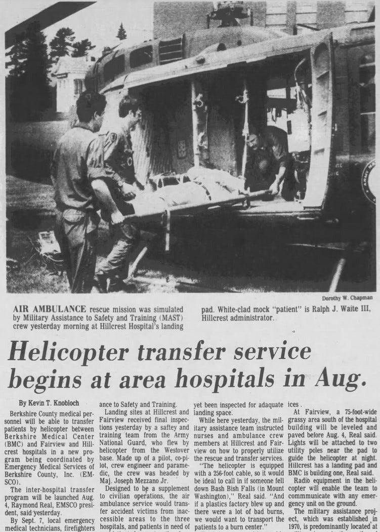 In the summer of 1979, Fairview signed on to a helicopter-transfer service coordinated by Emergency Medical Services of Berkshire County. It utilized helicopters dispatched from the enormous Westover Air Reserve Base in Chicopee that would land at Fairview and transport patients to other hospitals. The program was part of a military-civilian partnership called Military Assistance Safety and Traffic (MAST) that was eyeing a similar arrangement at Pittsfield’s Hillcrest Hospital. (Hillcrest merged with BMC in 1996.)