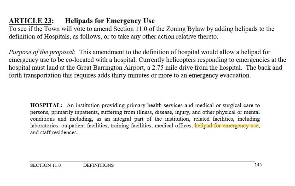 The hospital’s consideration must have been serious: In January 2016, it dispatched local attorney Kathleen McCormick to a Great Barrington Planning Board meeting to propose a change to the town’s zoning bylaw to permit a helipad in the hospital’s Berkshire Heights residential neighborhood. According to minutes of the meeting, the board determined the best solution was to expand the bylaw’s definition of hospital facilities to include “helipad for emergency use.” A public hearing on zoning-bylaw changes a couple of months later included little comment on the helipad proposal and it was forwarded to town meeting for a vote.
