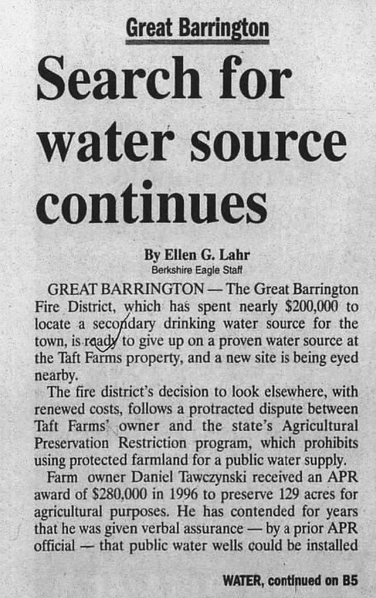 In 2005, they found a strong contender on property owned by Taft Farms, near the intersection of Division Street and Route 183. A test well produced 1,000 gallons a minute, according to news reports at the time. But the land there is in a permanent agricultural restriction; the state repeatedly blocked using it as a town water supply. Attempts by legislators and others to overcome that legal roadblock have all failed.