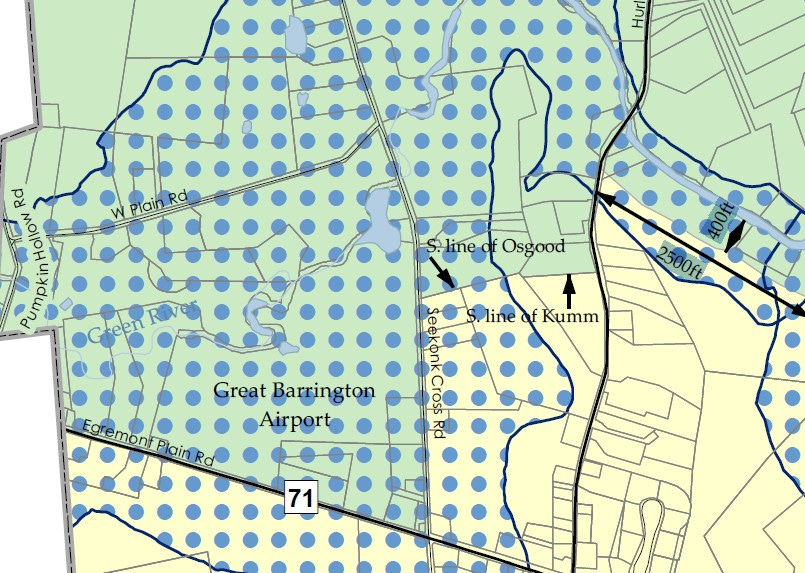The SWAP report led to action. Three years later, at their May 2006 annual town meeting, Great Barrington voters approved groundwater-protection provisions known as the Water Quality Protection Overlay District (WQPOD). It’s a zoning designation that limits activities in sensitive areas connected to drinking water supplies and close to important water resources like rivers and streams. It prohibits a host of activities and puts strict limits on others, including the use, production, and storage of hazardous materials and waste. It banned underground storage of fuel unless already existing. The airport’s two USTs could remain and be upgraded only if replaced by tanks of the same size or smaller. Specific requirements for above-ground fuel storage were also adopted. The airport’s 90-acre property is entirely within the WQPOD.