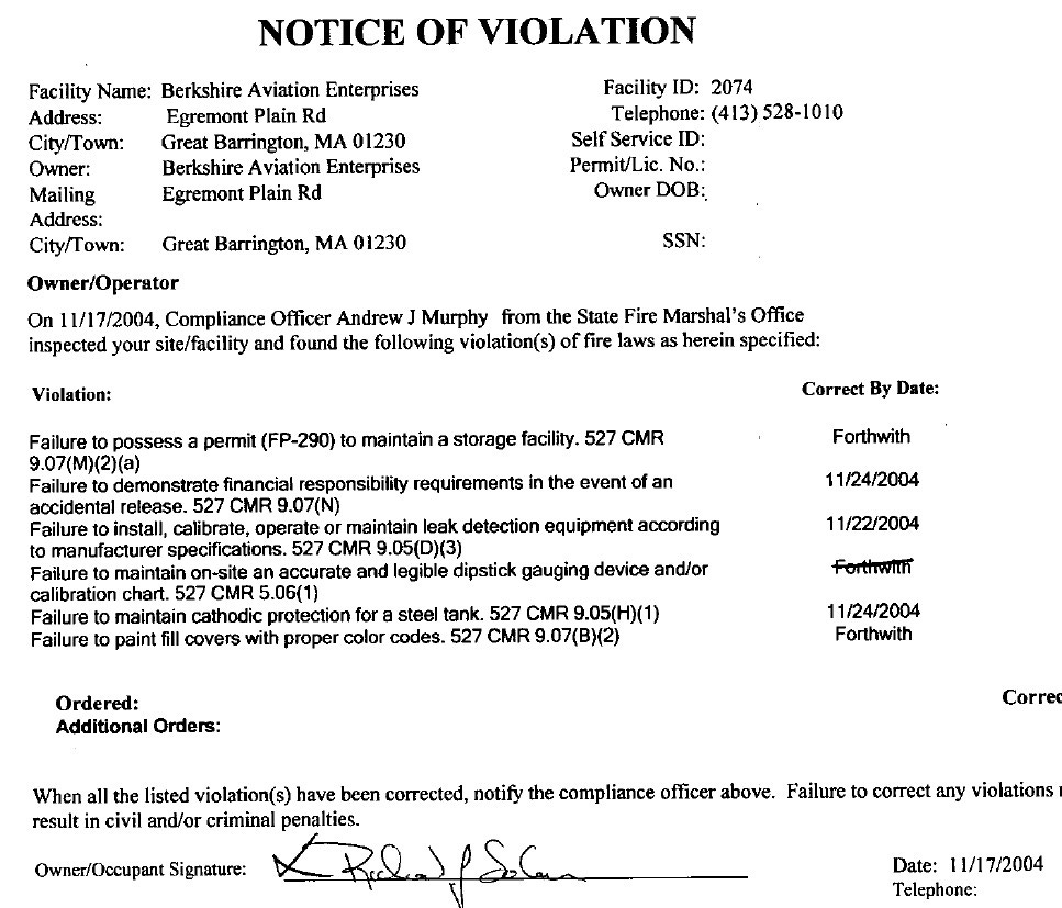 There were more violations that year. A permit to operate USTs was not available to show the inspector, and there was no evidence that required corrosion prevention was in place for some piping. The airport had also failed to conduct the required annual test of its line-leak detectors. A visit from a MassDEP inspector a month earlier as part of the agency’s “UST Facility Compliance Assistance Initiative” had once again found no on-site documentation of the required financial responsibility. (It provided evidence of private insurance the next month.)