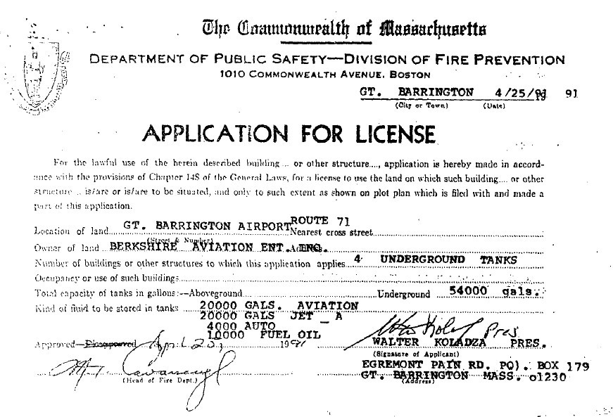In response to the public-records request, the Great Barrington Fire Department provided the Argus with all documents in its file related to the airport’s USTs. Charles Burger, a 20-year veteran of the department who rose to chief in 2013 and is leaving his post at the end of March, told me in an email that he generally leaves UST regulatory compliance to state agencies.