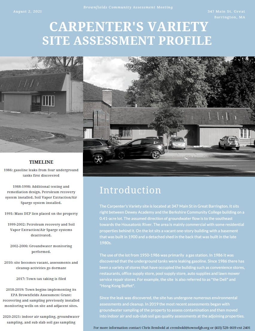 Great Barrington has seen its own serious issues with leaking underground tanks, notably at the former Carpenter’s Variety (a.k.a. Whittaker’s gas station) on Main Street, directly across from Town Hall. At that location, gasoline from leaking USTs flooded into the soil and groundwater. It was discovered in 1986 by an electrician who smelled gasoline while working inside Searles Castle—hundreds of feet away. The gas station owner, William Whittaker, insisted any leak was small. “When we put 4,000 gallons in, we took 4,000 gallons out,” he told the Berkshire Eagle at the time. He described using a daily log to keep track of inventory. “We would have known if we were losing a lot of gas,” he said, incorrectly.