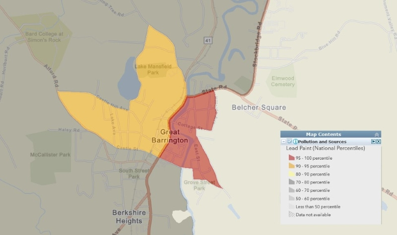While the Centers for Disease Control lists soil near airports as a significant lead-related health risk, the greatest overall danger is still from lead paint in old houses. According to EPA data, Great Barrington’s older housing stock puts it right at the median, 50th percentile of lead-paint risk in the United States, with a concentrated area downtown reaching beyond the 90th percentile.