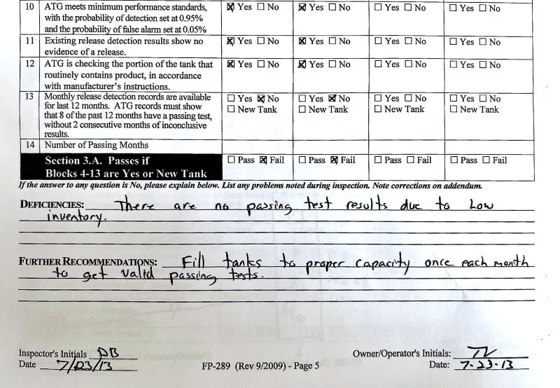Three years later—the next time a full third-party inspection was required—a report highlighted many of the same failures, particularly on leak testing. “There are no passing test results due to low inventory. Fill tanks to proper capacity once per month to get valid passing tests,” the inspector wrote on July 23, 2013, echoing results and recommendations from 2010.