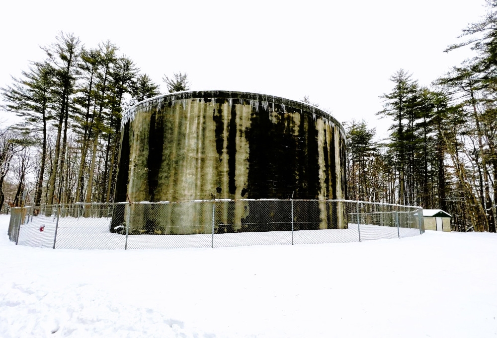 We had started not long after sunrise at Marks’ office at the fire district’s garage on East Street, visited the infiltration gallery and pumping station, and finally climbed that hill in a beefy fire district pickup truck to see the storage tank. On the other side of Great Barrington, off Blue Hill Road, there’s another one. It is shorter and wider but also holds 1.5 million gallons. The elevation of the water in each is precisely 1,023 feet; switching between them has no effect on the system’s water pressure.