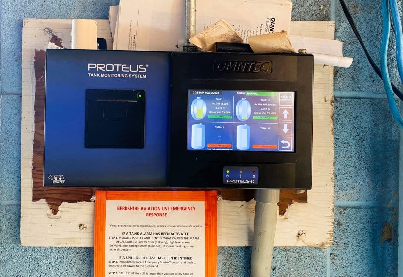 There is definitely an alarm: Joe Solan told me that the airport’s UST system has a leak alarm inside the maintenance hangar that’s so loud it can be heard outside even with the hangar doors closed. But the airport is not staffed all the time, and he said the system does not send text or email alerts—something the airport’s system can do by default if connected to the Internet.