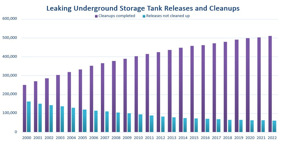 With new state and federal action, by the mid-1990s the number of UST releases leveled off and began to trend downward. According to EPA data, since 1984, nearly 570,000 UST releases have been identified and 509,000 have been cleaned up. With increased awareness of their environmental risks, the total number of underground storage tanks has declined from 2.1 million in 1984 to 540,700 today. State environmental data reported to EPA shows that UST releases of petroleum products are, by far, the top reason for groundwater contamination in the United States.