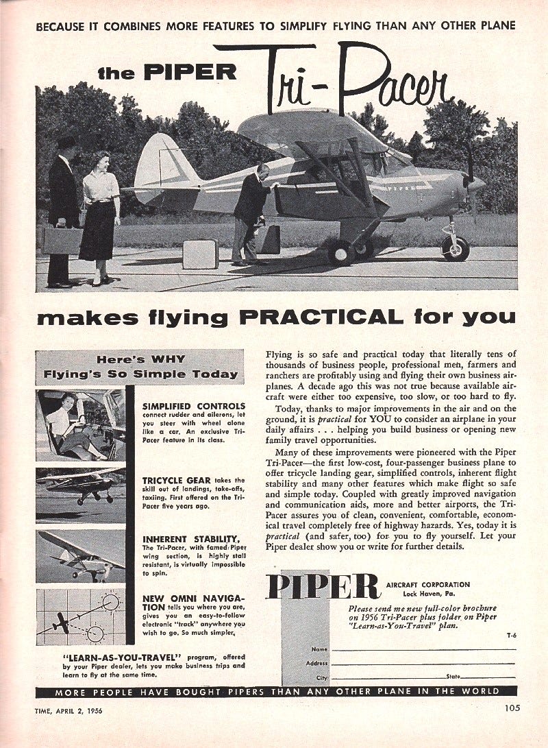 Since last September’s accident, the destroyed Tri-Pacer has remained up on blocks on the northern edge of the airport. That model of short-winged Piper went on sale in the early 1950s and was pitched as a low-cost, four-passenger airplane that anyone could fly. An advertisement in Time Magazine in 1956 said—perhaps with dangerous overstatement—that its tricycle landing gear “takes the skill out of landings, take-offs, taxiing.” The plane, the ad boasted, offered “clean, convenient, comfortable, economical travel completely free of highway hazards.”