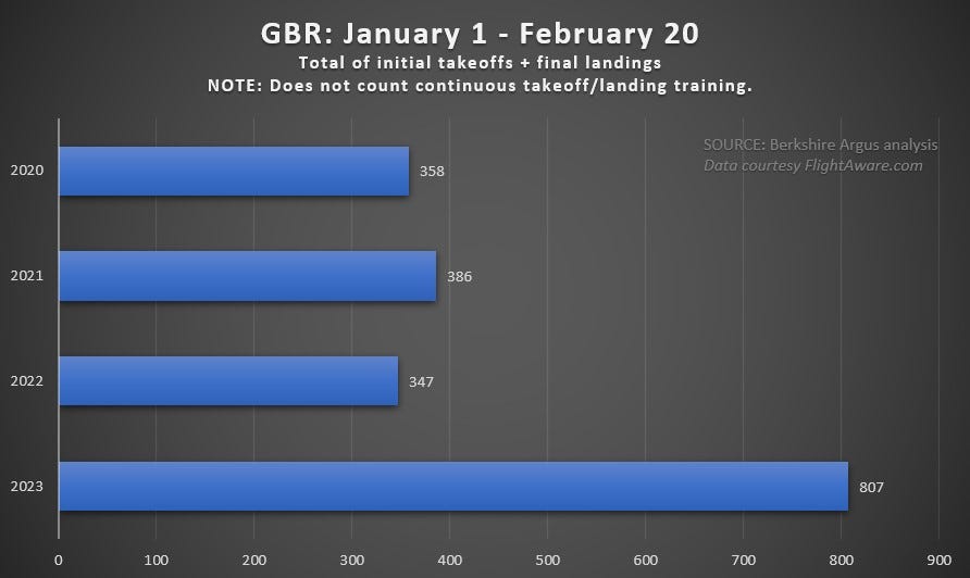 An Argus analysis of actual airport flight data from 2020 through February 2023 documented the increase that began a few months into the pandemic and continued through the following few years. Traffic associated with BAE’s flight school increased by 125 percent from 2020 to 2022. There was also a further 133 percent increase in overall traffic during the first six weeks of 2023 over the same period last year. (Airport attorney Dennis Egan told the Selectboard last month that the Argus analysis of data from FlightAware was “nonscientific.”)