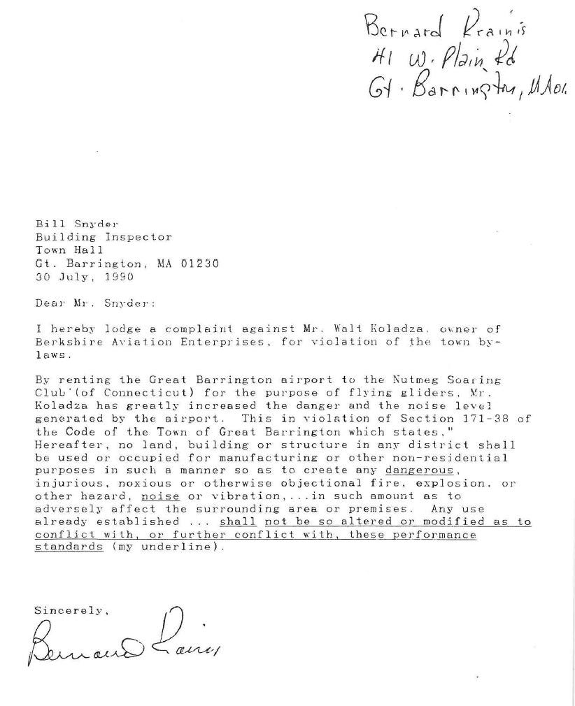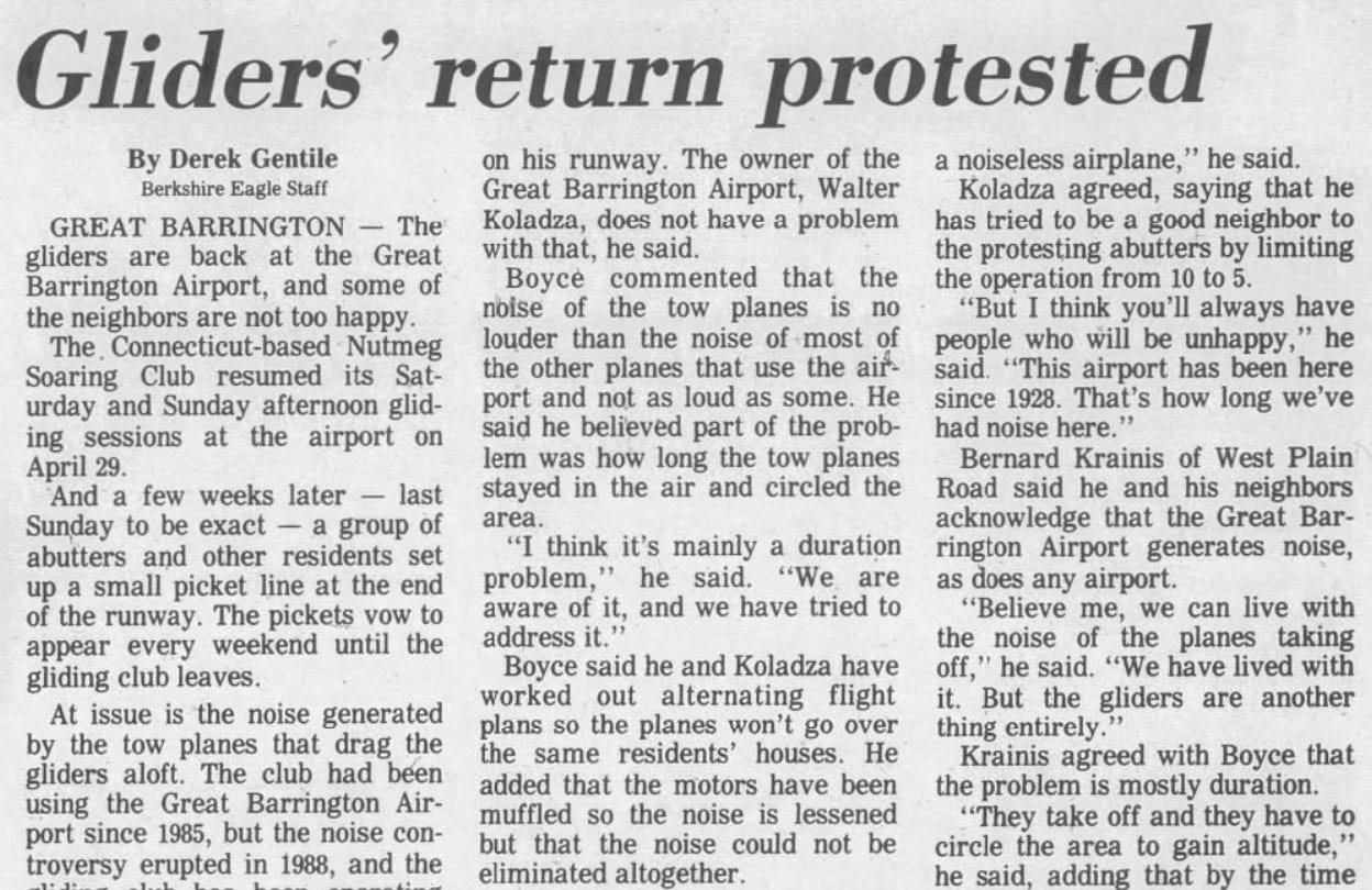 The Nutmeg Soaring Club returned to Great Barrington in late April 1990. They were back, not surprisingly, because they had been forced out of another Connecticut airfield due to noise complaints and because other pilots didn’t like them clogging the flight pattern. So it was also no surprise that Koladza soon received the usual complaints and, once again, calls for the gliders to leave.