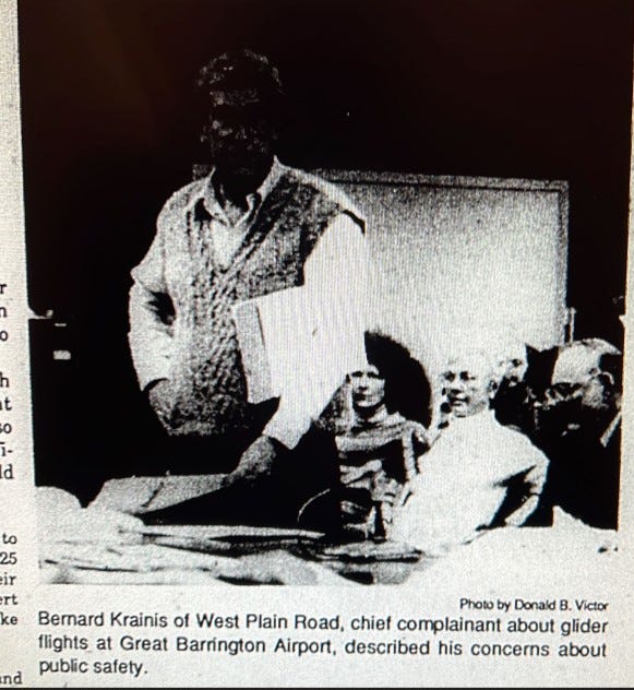 Evidence that this was all taking place in a small town emerged the day before the second hearing. An Eagle story featured news that two members of the three-person Selectboard supported keeping gliders at the airport. “Ed [Morehouse] and I have never been opposed to the operations of gliders at the airport,” said the board’s chairman, Richard J. Louison. “As far as I’m concerned, the gliders can operate there for as long as the airport is there. I have no problem with them,” Louison said. But he also insisted, “We have nothing to do with it,” saying it was a decision for the ZBA.