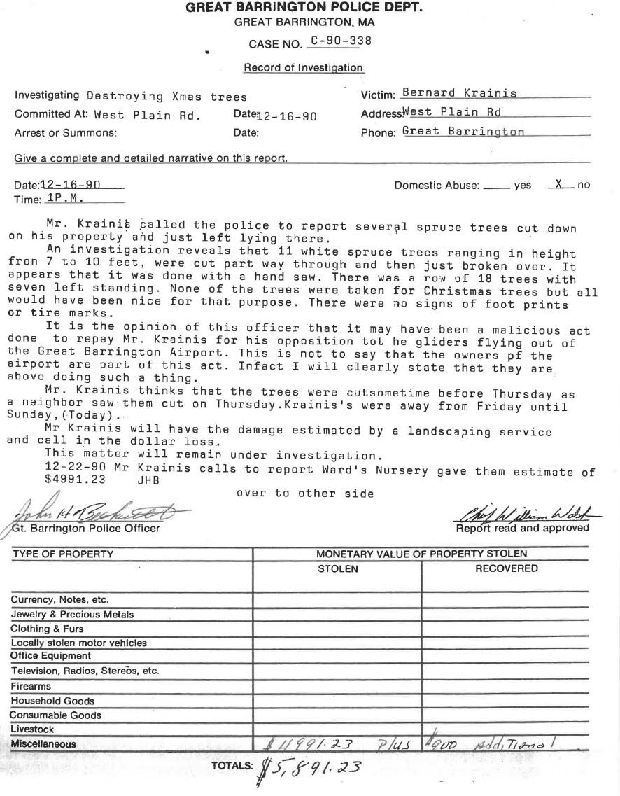 The president of the gliding club, L. Corwin Sharp, sent a letter of appreciation to the Great Barrington Police, thanking them for the force’s “prompt, efficient, and professional manner” at the site of the crash in Krainis’ yard. Revealing a not insignificant lack of knowledge of the community in which his club had stirred up controversy, his letter was carbon-copied to “Mayor, City of Great Barrington.”