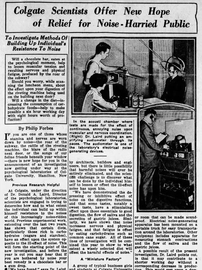 And just a few weeks after the airport began operations in September 1931, the Courier included an odd half-page advertisement, suggesting that people could be desensitized to annoying sounds by eating certain kinds of foods—particularly candy—at the right time. (The ad ran in dozens of papers across the country and was not targeted only at communities dealing with “planes with noisy motors.”)