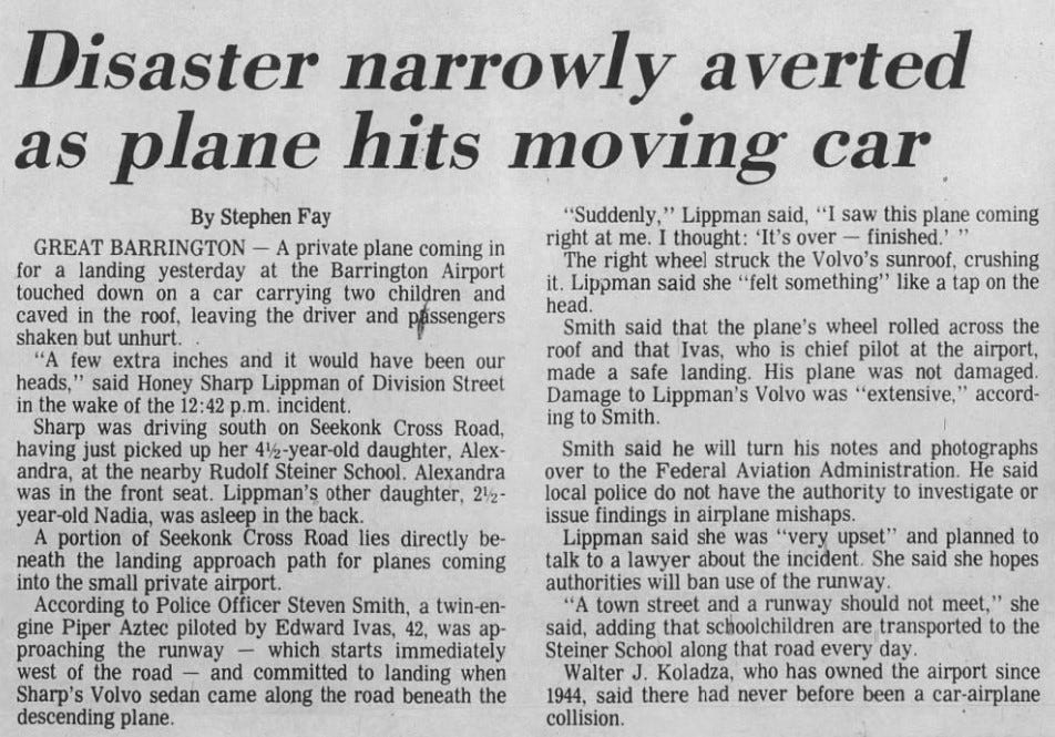 As she headed south on the rural two-lane road, enjoying the bright, early spring, she reached up to open the sunroof of her Volvo. At that moment, as she passed the end of the airport runway—which abuts Seekonk Cross Road—her car was struck by the wheel of a landing airplane, crushing part of the roof and pushing the car onto the shoulder. The plane, a powerful twin-engine Piper Aztec, was piloted by Edward Ivas, a longtime Berkshire Aviation Enterprises (BAE) charter pilot, flight instructor, aircraft mechanic, and one of four men who would inherit the airport after Koladza’s death in 2004. An experienced and skilled aviator, Ivas was able to land his charter flight safely, and he and his two passengers escaped injury.