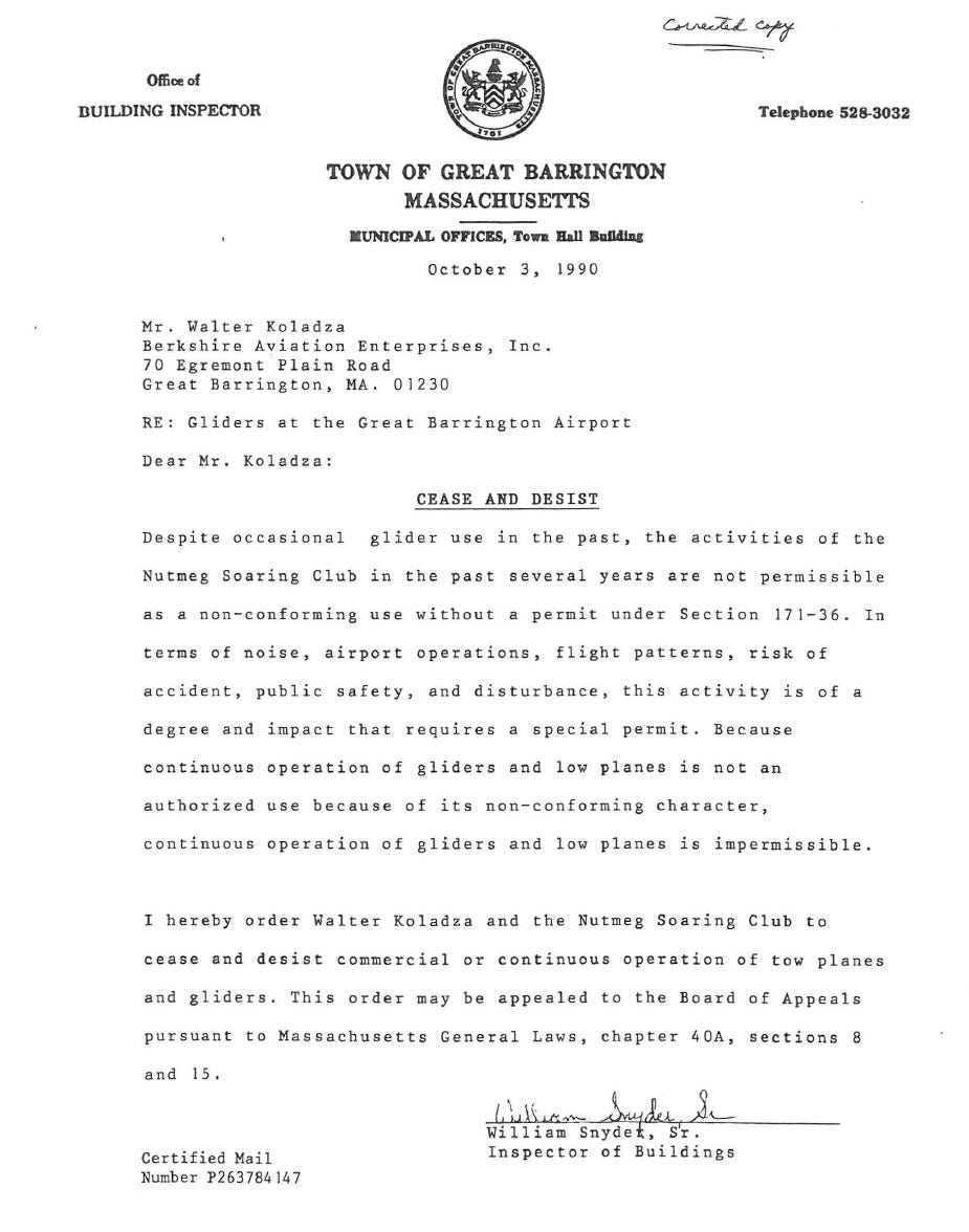 For the first time in its history, in early October, the airport was subject to zoning enforcement. “I hereby order Walter Koladza and the Nutmeg Soaring Club to cease and desist commercial or continuous operation of tow planes and gliders,” Snyder wrote in an order sent to the airport via certified mail. “Despite occasional glider use in the past, the activities … in the past several years are not permissible as a non-conforming use,” the order explained. “In terms of noise, airport operations, flight patterns, risk of accident, public safety, and disturbance, this activity is of a degree and impact that requires a special permit.”