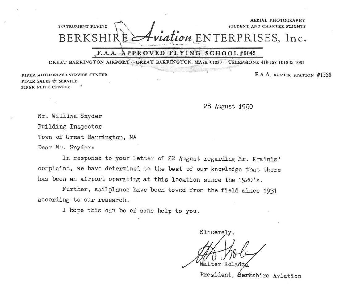 For his part, at the end of August, Koladza sent Snyder a brief, three-sentence letter. “We have determined to the best of our knowledge that there has been an airport operating at this location since the 1920’s. Further, sailplanes have been towed from the field since 1931 according to our research. I hope this can be of some help to you.”