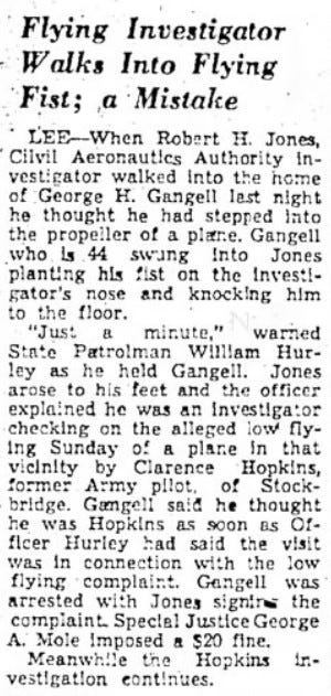 That unrelated Robert H. Jones made the pages of the Eagle in May 1946 for an incident related to aircraft noise. There had been complaints that Clarence Hopkins, a former Army pilot from Stockbridge, had been making noisy low flights over houses in Lee. When a state patrolman named William Hurley appeared at the door of Lee resident George H. Gangell, who had filed one of the complaints, Hurley explained he was there to investigate. The 44-year-old Gangell assumed that Jones, who was standing next to Hurley, was Hopkins, the offending pilot. So he swiftly punched Jones in the face, earning an arrest and a $20 fine. For his part, Hopkins was summoned a few days later to Berkshire District Court to answer for the low flights over Pleasant Street.