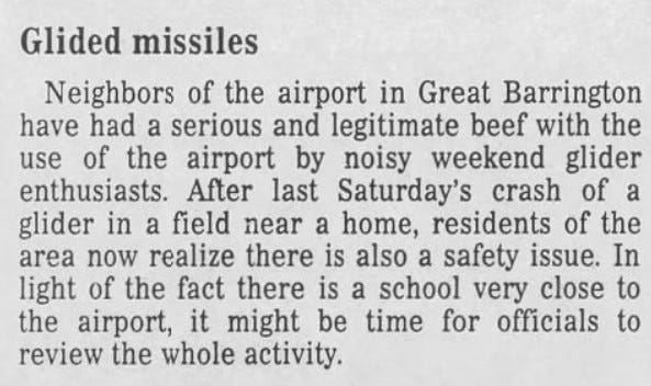 The Eagle chimed in with a short editorial titled “Glided Missiles” that called for an investigation; a few months later it endorsed a complete end to glider operations. And the Selectboard, hinting that it couldn’t or wouldn’t do much, at least said it would look into the matter.