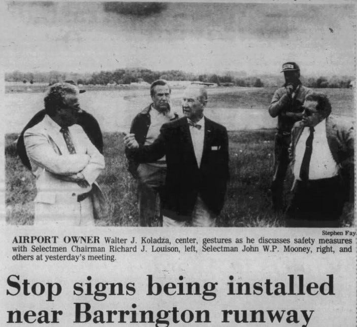 As detailed in part two of this series, Koladza bought the airport in 1945 and had, over the course of four decades, expanded its facilities and operations without acquiring required town approvals. But he did so with few public complaints from those living nearby. Depending on who you ask, that’s attributable to Koladza’s sensitivity to his residential neighbors; fewer (or different) people living nearby; or simply an understanding that complaining to town officials, who had long winked at the airport’s skirting of zoning rules that applied to everyone else, would not be fruitful. But some chinks soon appeared in the airport’s armor.