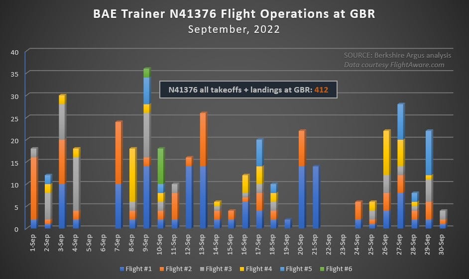 In FlightAware’s dataset, the aircraft’s total of initial takeoffs and final landings at GBR over those 30 days totaled 172. So, in September, the actual number of takeoffs and landings at Great Barrington by N41376 was 140 percent higher than what’s reflected in the FlightAware data. While that’s useful, every training flight is different; students pursue a variety of training objectives on the way to their various certifications. So that’s not a percentage that can be applied across all FlightAware data.