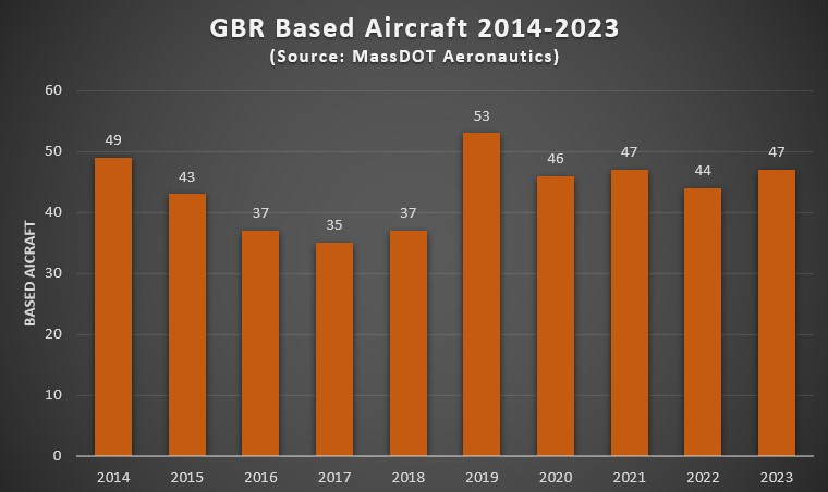 The Argus also obtained based-aircraft reports for 2014 through 2023 for GBR from MassDOT via a public-records request. In the years before the airport’s first hangar proposal, it was losing based aircraft, with a three-year decline of nearly 30 percent, from 49 in 2014 to 35 in 2017. That could have added urgency to BAE’s efforts to get permission to build hangars to increase revenue—they planned to charge $400 or more per month per plane, far more than the $50 per month it said it charges for outdoor tie-downs.