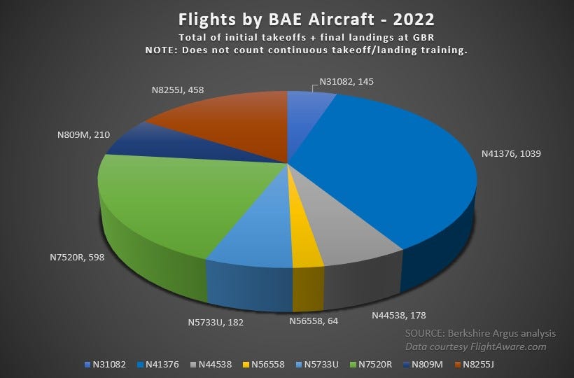 Among all GBR-based aircraft, which includes 14 owned by BAE and minority partner Jim Jacobs, in 2022, flight-school aircraft made up 76 percent of initial takeoffs and final landings. On average, the other airplanes each logged just under 20 initial takeoffs and final landings, based on the FlightAware data. Since a few based aircraft are not equipped with ADS-B Out, and are therefore not tracked, the actual per-based-plane operations for non-flight-school aircraft is likely slightly higher, and the portion attributable to flight-school aircraft slightly lower by an indeterminate amount. There were a handful of non-BAE, GBR-based planes that flew substantially more than the average.