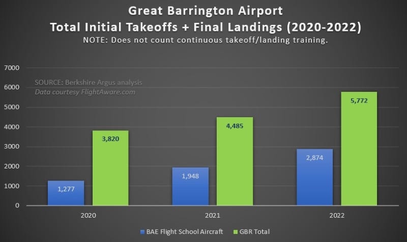 The tracked-flights data shows a 125 percent increase in flight-school-related flights from 2020 to 2022 and a 51 percent increase overall at GBR. The proportion of all traffic associated with flight-school planes increased from 33 percent of all tracked flights in 2020 to 50 percent in 2022. (Again, these counts only tally the initial takeoff and final landing of each flight, and not any additional takeoffs and landings in-between.)