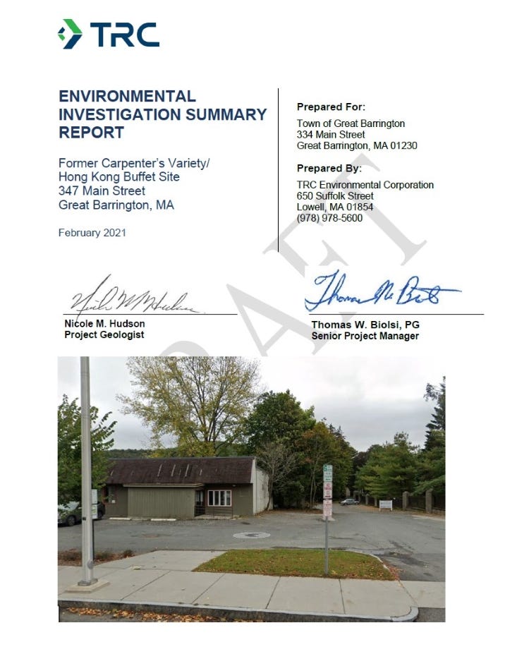 In 2018 the town received a $300,000 EPA grant, administered by the Berkshire Regional Planning Commission (BRPC), to do brownfields assessments at that location as well as the polluted Reid Cleaners site further north on Main Street and at Cooks Garage in Housatonic. (Rasch serves on BRPC’s Berkshire Comprehensive Economic Development Strategy Committee.)