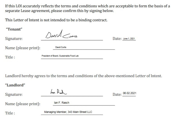 That June 2021 LOI was signed by David Curtis, a Stockbridge resident and former banker who serves on the board of economic-development group 1Berkshire and whose LinkedIn profile describes various ventures supporting and mentoring entrepreneurs here and on Cape Cod. The letter called for Sustainable Food Lab Berkshires to occupy 4,500 square feet for $9,000 per month, or $108,000 per year. It was signed by Curtis as the “President of Board, Sustainable Food Lab.”