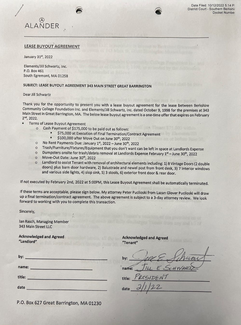 On March 17, 2021, one day after signatures were placed on that contract addendum that called for BCC to address the issue or evict Elements, a Pittsfield attorney representing the BCC Foundation, Emil George, sent a certified letter to Schwartz. He declared her in default of her lease terms and wrote that BCC was terminating the lease “effective upon receipt of this letter.” It was, he wrote, based on BCC’s claim that Elements’ use of E6000 glue could mean “potential legal liability from its tenants and visitors to 343 Main Street.”