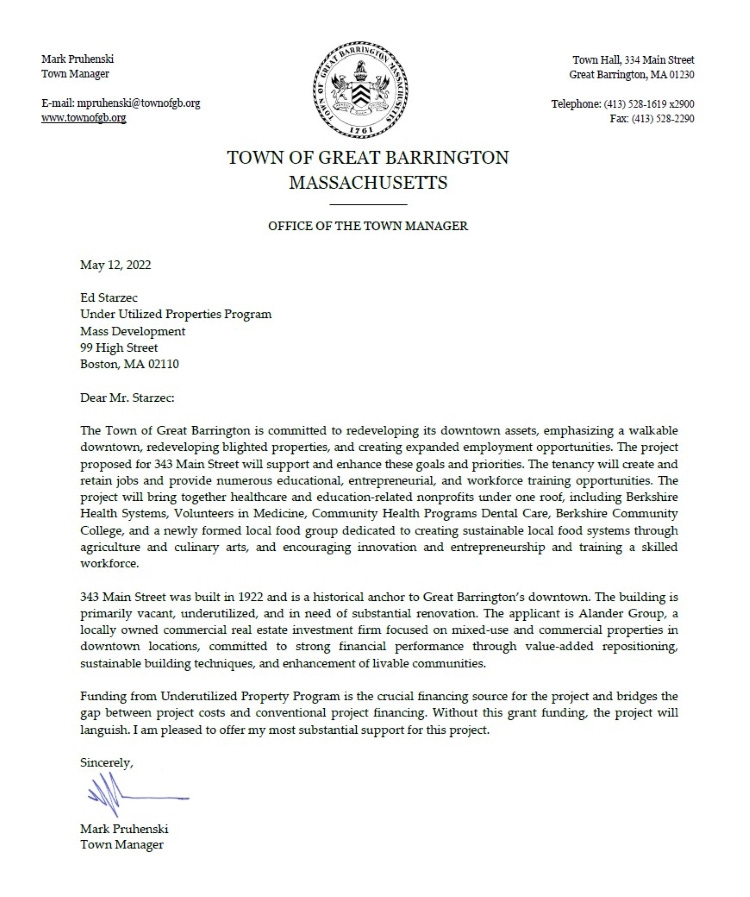 That formal indication of municipal support came in a May 12, 2022 letter from Town Manager Mark Pruhenski. It featured similar language to that seen in support letters attached to both the CPA and UPP grant applications, noting the underutilized historic building and promoting the planned health, wellness, and vocational-training tenants. It promised a project that would “create and retain jobs and provide numerous educational, entrepreneurial, and workforce training opportunities.”