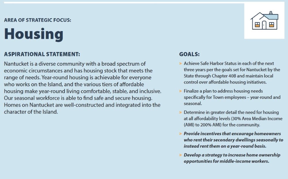 His position originally reported to the town planner but he has since been made a direct report to the town manager. The Select Board has made housing a priority and every year issues a specific list of goals within Nantucket’s concise strategic plan—rooted in things like Nantucket’s master plan and housing-production plan but which presents focused and actionable goals.