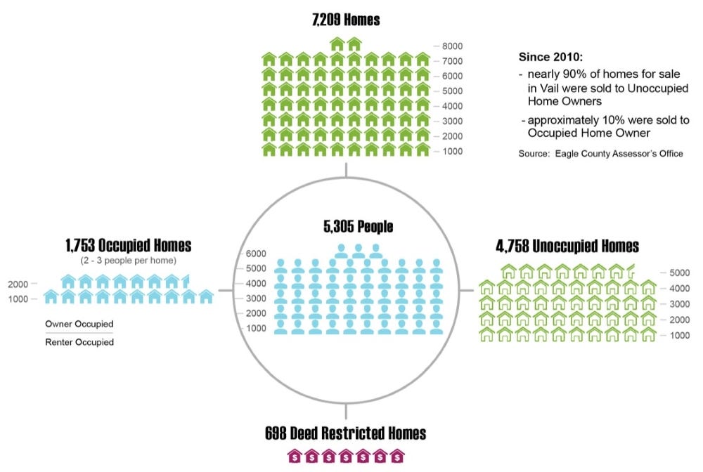 As part of his pitch, Ruther showed the council that over the prior six years, nearly 90 percent of homes for sale in Vail were acquired by “unoccupied home owners,” which includes part-time residents and properties used exclusively for seasonal or short-term rentals. This appeared in a stark and effective chart that demonstrated the clear need for 1,000 additional homes reserved in some way for working residents.