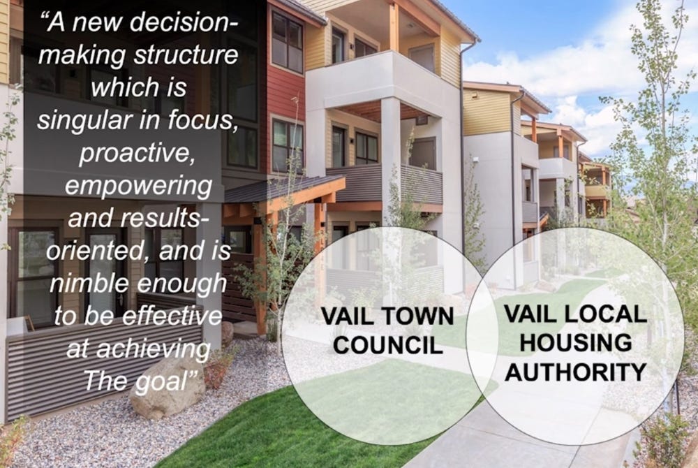 It delegated authority to a freshly empowered Vail Local Housing Authority peopled by appointed members with housing-related expertise to act on behalf of the Vail Town Council and start purchasing resident-worker deed restrictions. It also created a simplified decision-making structure that required only twice-annual reports back to the Council. “A new decision-making structure is needed to get better results,” the plan said, arguing that a housing-focused entity had to be “singular in mission and focus” and “empowered and results-oriented.”