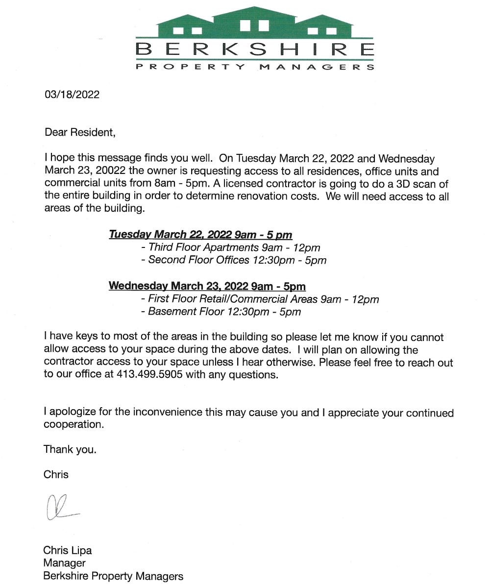 Even after the pending sale became public, there was still no communication from owner to tenants—or after The Berkshire Eagle reported additional details in early September. (Ground-floor tenants received a mid-October notice of the sale with instructions to send November rent to Rasch.)